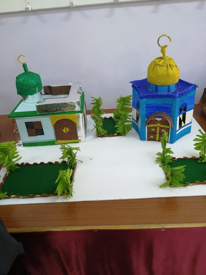 احتوى المعرض على رسومات ومجسمات تمثل الأماكن المقدسة من عمل الطالبات والتي تعزز الوازع الديني لدى الطالبات.