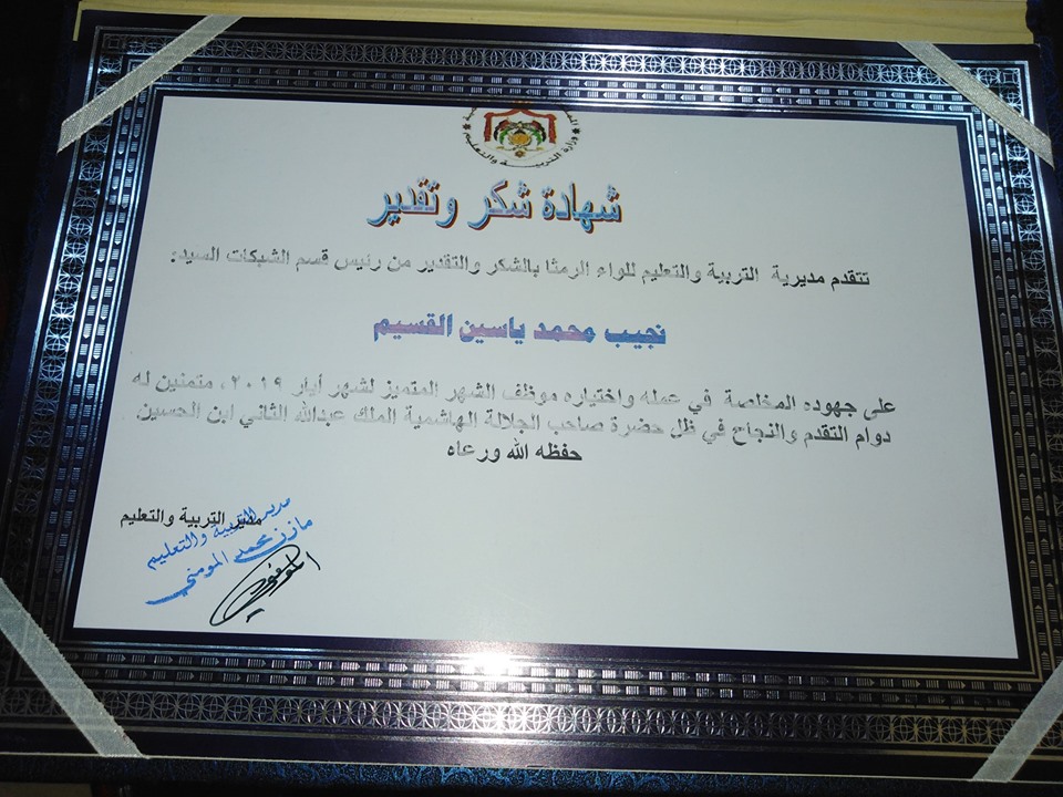 كرم عطوفة مدير التربية والتعليم الاستاذ مازن المومني اليوم الاثنين الموافق ٢٠١٩/٦/٣ موظف الشهر المتميز لشهر ايار للعام الدراسي ٢٠١٩ الأستاذ نجيب الشبول رئيس قسم الشبكات متمنيا له التوفيق والنجاح .