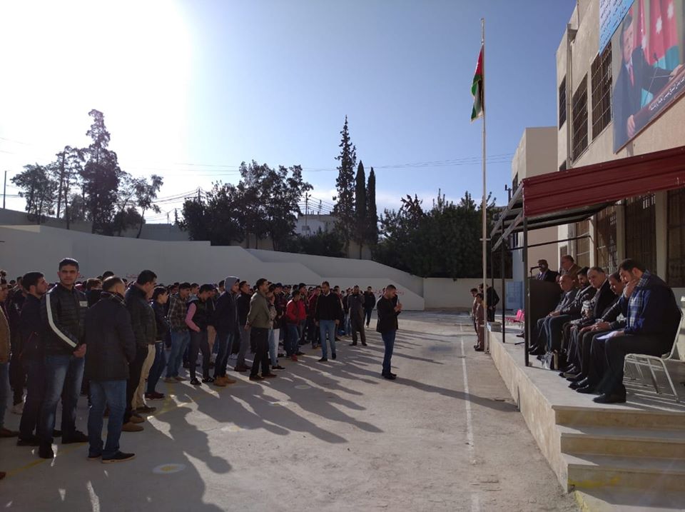 بدأ الطابور بالسلام الملكي وآيات من الذكر الحكيم ثم كلمة لمدير المدرسة الدكتور عبدالله الوردات رحب بالحضور ثم هنأ الطلبة بعودتهم إلى مدرستهم بعد الانتهاء من أعمال الصيانة والتي تكفل بها الشيخ عيسى الجمال كما استذكر بطولات المتقاعدين العسكريين والمحاربين القدامى.