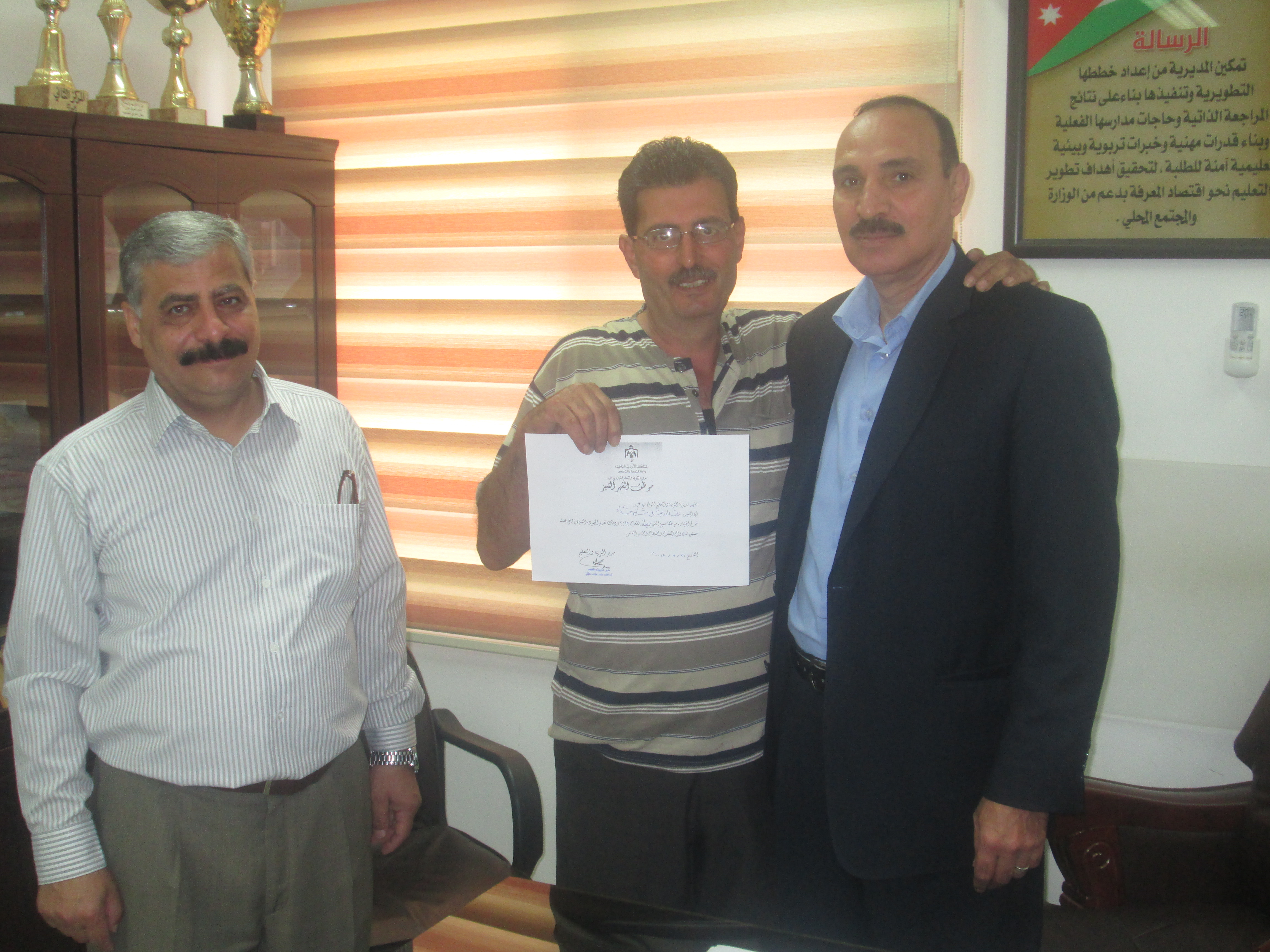 بناءً على تنسيب رئيس قسم الرقابة الداخلية السيد سالم الخصاونة واللجنة المشكلة لاختيار الموظف المتميز فقد قرر مدير التربية والتعليم للواء بني عبيد الدكتور منذر صلاح اختيار السيد زيدان جميل حداد من قسم الأبنية موظف الشهر المتميز لشهر حزيران لجهوده وتفانيه في العمل متمنيا له مزيداً من التقدم والتوفيق