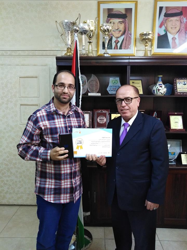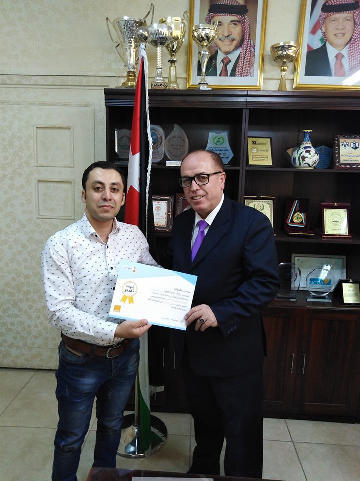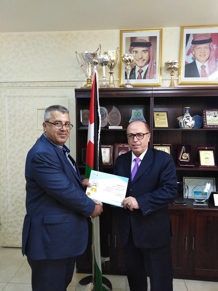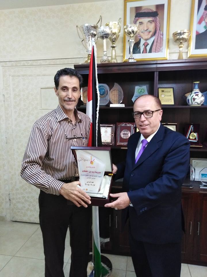 كرم عطوفة مديرالتربية والتعليم الاستاذ مازن المومني في مكتبه وبحضور مدير الشؤون التعليمية والفنية الدكتور طالب العمايره ومدير الشؤون الادارية والمالية الاستاذ وحيد العمري كوكبة من اداري ومعلمي مدرسة زيد بن الخطاب الذين تم تكريمهم من قبل مركز الملكة رانيا ووزارة التربية والتعليم ممثلة بمندوب معالي وزير التربية والتعليم عطوفة الامين العام الدكتور محمد العكور والشركاء الذين يطبقون برنامج منهاجي التفاعلي والذي يمزج بين التعليم الالكتروني مع المنهاج وقد تفوقت المدرسة في هذا البرنامج حيث حاز المعلم احمد غسان الشرع على المرتبة الاولى على مستوى المدارس المشاركة في المملكة في مجال قيم مختبر الحاسوب وحصل على جائزة قيمة .