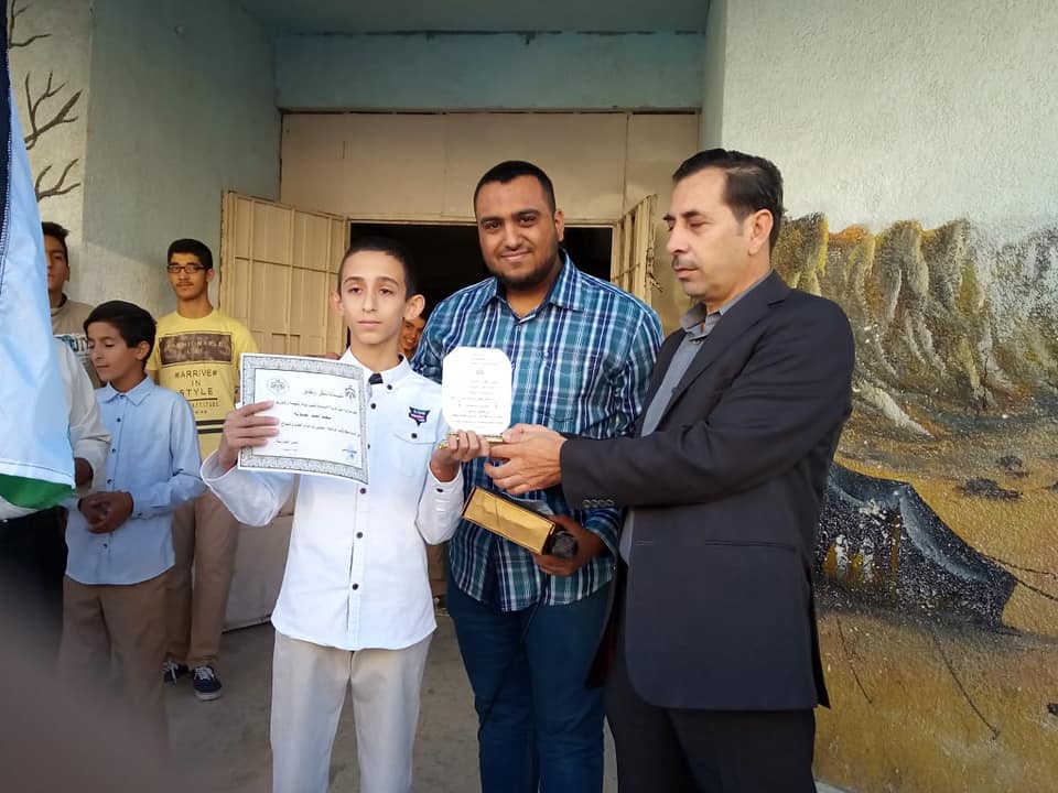 كرم مدير مدرسة أبو هريرة الأستاذ أحمد الربيحات الطالب محمد حسونه من الصف التاسع  وذلك لإتمامه حفظ القرآن الكريم كاملا