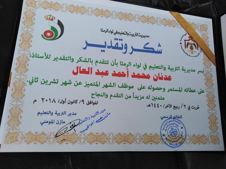 كرم عطوفة مدير التربية والتعليم الاستاذ مازن المومني اليوم الاحد الموافق ٩/١٢/٢٠١٨ موظف الشهر المتميز لشهر تشرين الثاني للعام الدراسي 2018 الموظف عدنان عبدالعال عضو قسم التعليم العام متمنيا له التوفيق والنجاح .