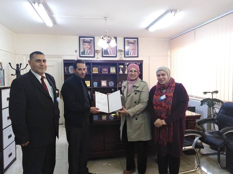 مندوبة عن عطوفة مدير التربية والتعليم للواء بني عبيد السيدة ثريا حمادنة قامت رئيس قسم النشاطات والرياضة المدرسية السيدة رنا القواسمي بتكريم عطوفة مدير التربية الأستاذ مازن المومني ورئيس قسم المصادر الآنسة هدى الشطناوي وفني الصيانة السيد انور شنيور وبحضور الدكتور طالب العمايرة مدير الشؤون التعليمية والفنية وذلك على جهودهم المبذولة في تقديم خدمة صيانة الأجهزة المختلفة لمدارسهم متمنية ان يستمر التعاون بين المديريتين لخدمة أبنائنا الطلبة.