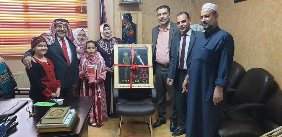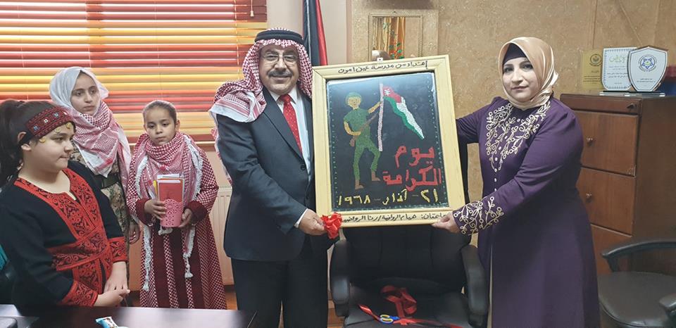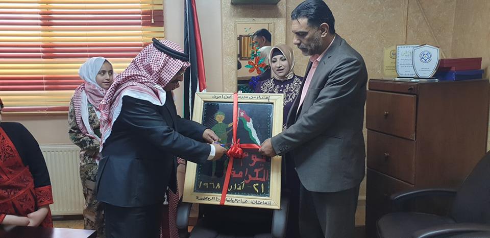 قامت مديرة المدرسة يسرى الفلحات يرافقها مجموعة من المعلمات والطالبات بزيارة لمكتب عطوفةمديرالتربية والتعليم الأستاذ محمد الهريشات وكان من الحضور مدير الشؤون التعليمية والفنية الاستاذ محمد الشقيرات ورئيس قسم الإشراف التربوي سميح الحجاج والدكتور اسماعيل قوابعه من تربية بصيرا لتقديم مجسم يعبر عن الجندي المجهول ويوم الكرامة من عمل المعلمات هيام الرواضيه و رنا الرواضيه .