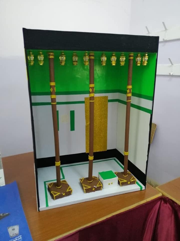 احتوى المعرض على رسومات ومجسمات تمثل الأماكن المقدسة من عمل الطالبات والتي تعزز الوازع الديني لدى الطالبات.