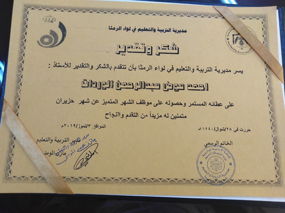 كرم عطوفة مدير التربية والتعليم الاستاذ مازن المومني اليوم الخميس الموافق 2019/7/4 موظف الشهر المتميز لشهر حزيران للعام الدراسي 2019 الأستاذ أحمد آلوردات رئيس قسم شؤون الموظفين متمنيا له التوفيق والنجاح .