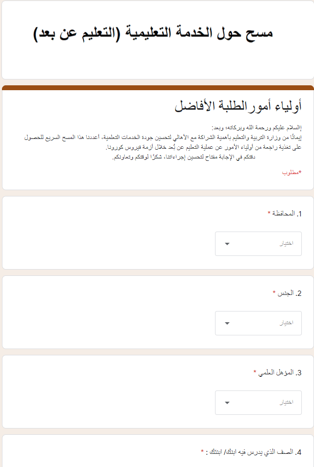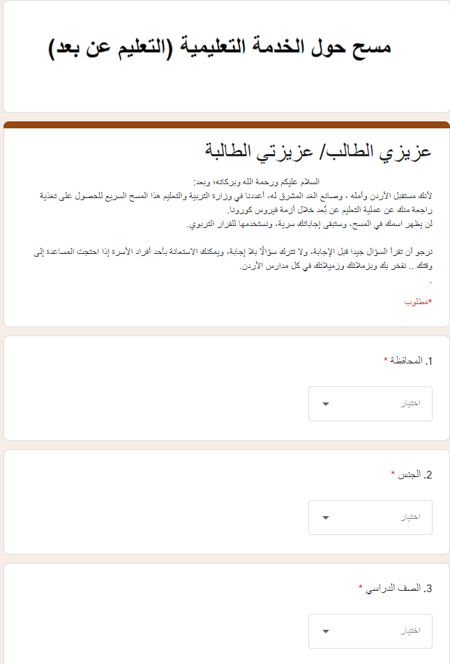 أعدت وزارة التربية والتعليم استبانات بحثية، نشرتها على منصتها الإلكترونية "نورسبيس"؛ للوقوف على آراء المعلمين والطلبة، وأولياء الأمور حول مشروع التعليم عن بُعد الذي تنفذه استجابة للإجراءات التي تنفذها الحكومة لمواجهة فيروس كورونا المستجد.
