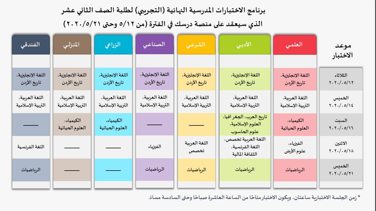 أعلنت وزارة التربية والتعليم برنامج الاختبارات المدرسية النهائية (التجريبي)، لطلبة الصف الثاني عشر الذي سيعقد على منصة درسك في الفترة (من ١٢ / ٥ وحتى ٢١ / ٥ / ٢٠٢٠).
