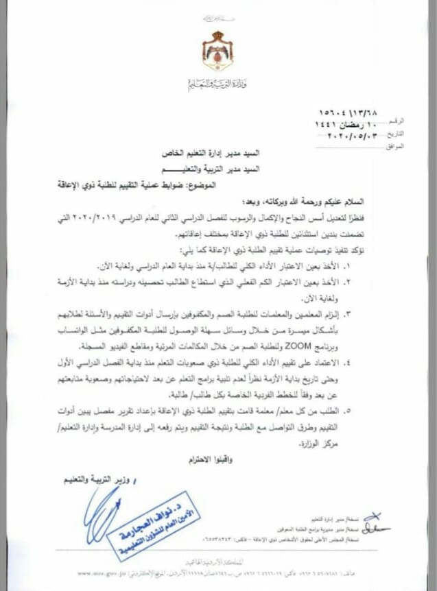 3. إلزام المعلمين والمعلمات للطلبة الصم والمكفوفين بإرسال أدوات التقييم والأسئلة لطلابهم بأشكال ميسرة من خلال وسائل سهلة الوصول للطلبة المكفوفين مثل الواتساب وبرنامج ZOOM وللطلبة الصم من خلال المكالمات المرئية ومقاطع الفيديو المسجلة.