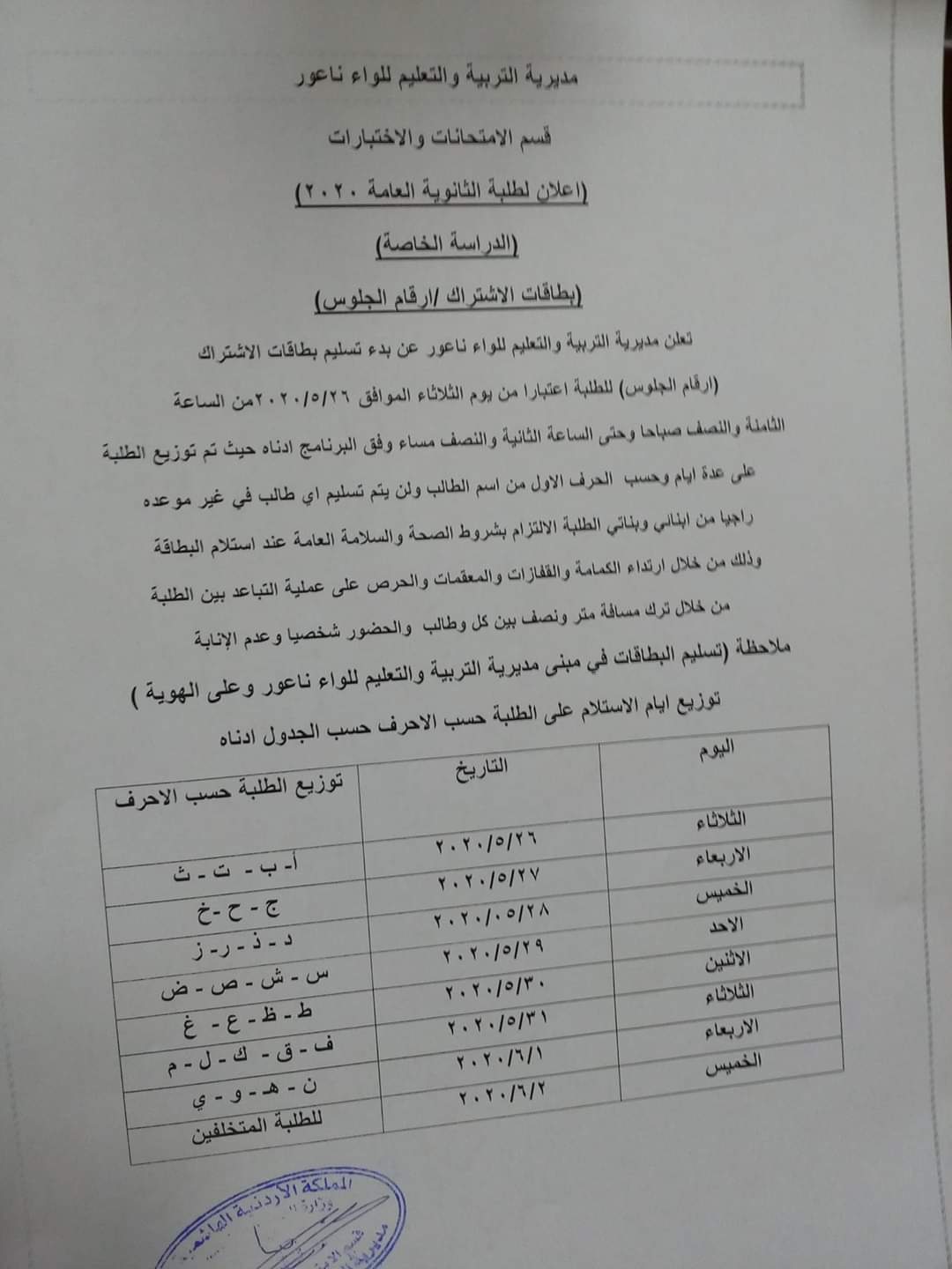 جدول مواعيد تسليم بطاقات الاشتراك ارقام الجلوس للثانوية العامة تربية لواء ناعور