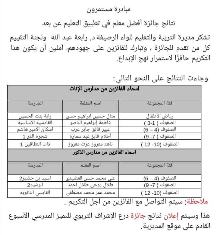 تشكر مديرة التربية والتعليم للواء الرصيفة د. رابعة عبد الله ولجنة التقييم كل من تقدم للجائزة ، وتبارك للفائزين على جهودهم، آملين أن يكون هذا التكريم حافزًا لاستمرار نهج الإبداع.