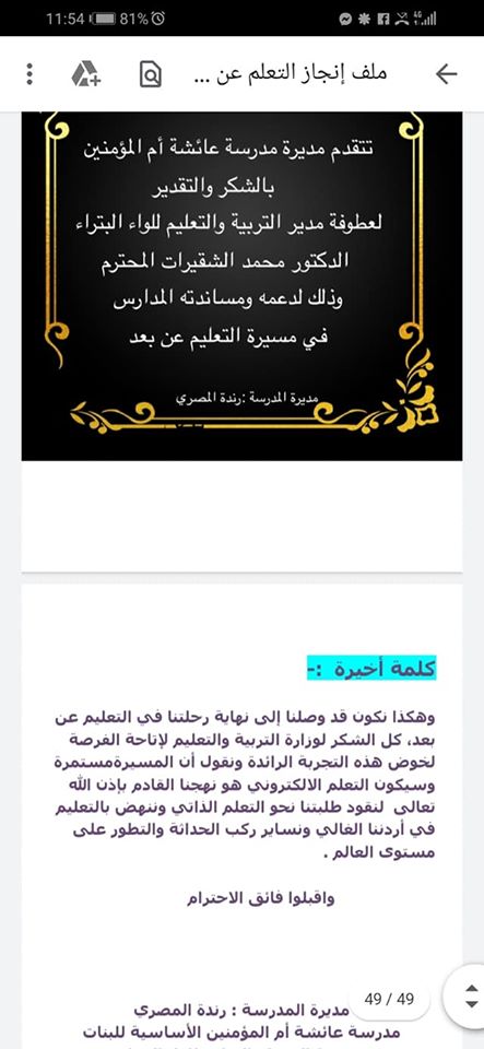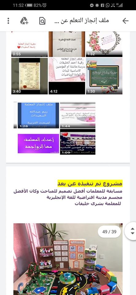 ضمن انطلاقة التعلم عن بعد في مدارس المملكة شارك عدد من مدارس مديرية التربية والتعليم للواء البترا بجائزة افضل ملف انجاز في التعلم عن بعد على مستوى/ المديرية والوزارة، حيث حصلت مدرسة عائشة ام المؤمنين الاساسية المختلطة على المركز الأول على مستوى المديرية.