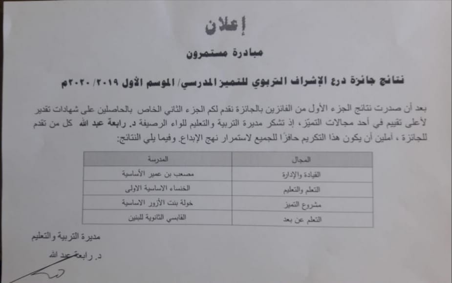 نتائج درع الاشراف التربوي للتميز المدرسي-الرصيفة