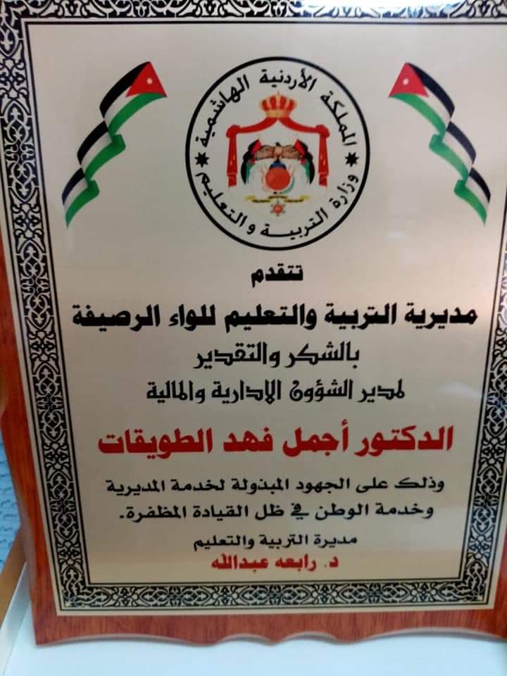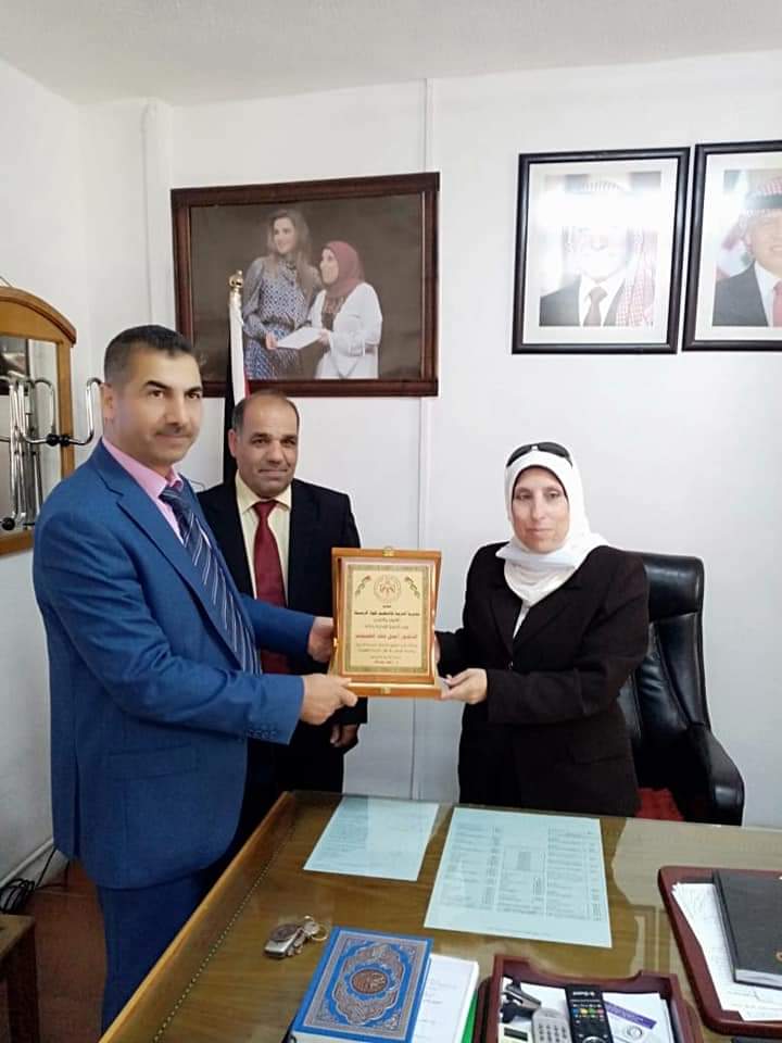قامت مديرة التربية والتعليم للواء الرصيفة د. رابعه عبدالله بلفتة طيبة بتكريم مدير الشؤون الادارية والمالية د.اجمل الطويقات وذلك تقديراً لجهوده الطيبة بخدمة المديرية وخدمة هذا الوطن في ظل القيادة المظفرة. متمنين للدكتور أجمل الطويقات التوفيق في موقع عمله الجديد في مديرية التربية والتعليم للواء عين الباشا.