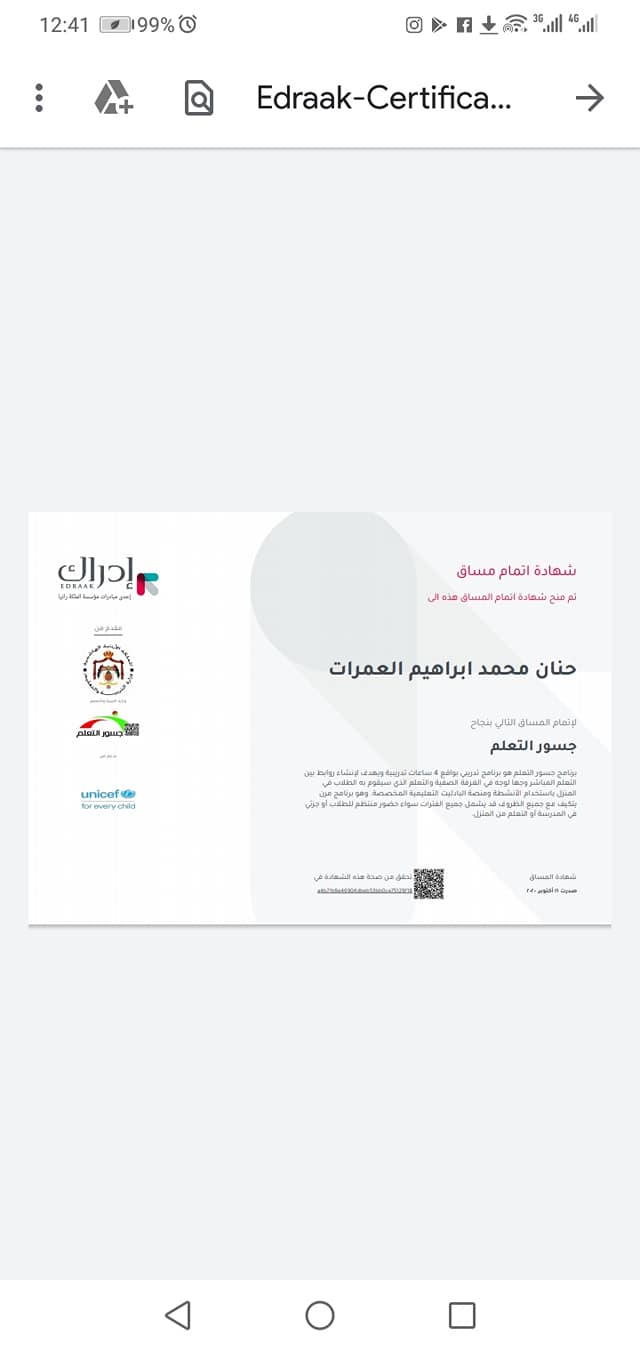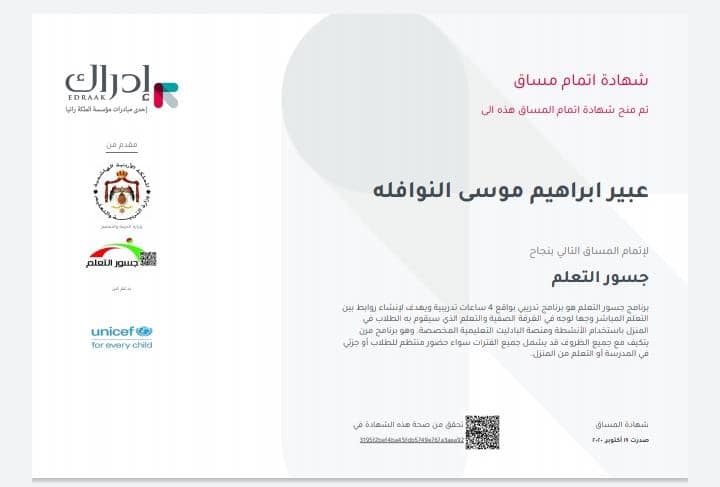 طبقت مدرستنا برنامج جسور التعلم بعد التدرب عليه والحصول على الشهادات عبر منصة ادراك من قبل أعضاء الهيئة التدريسية في بعض المجالات التخصصية.