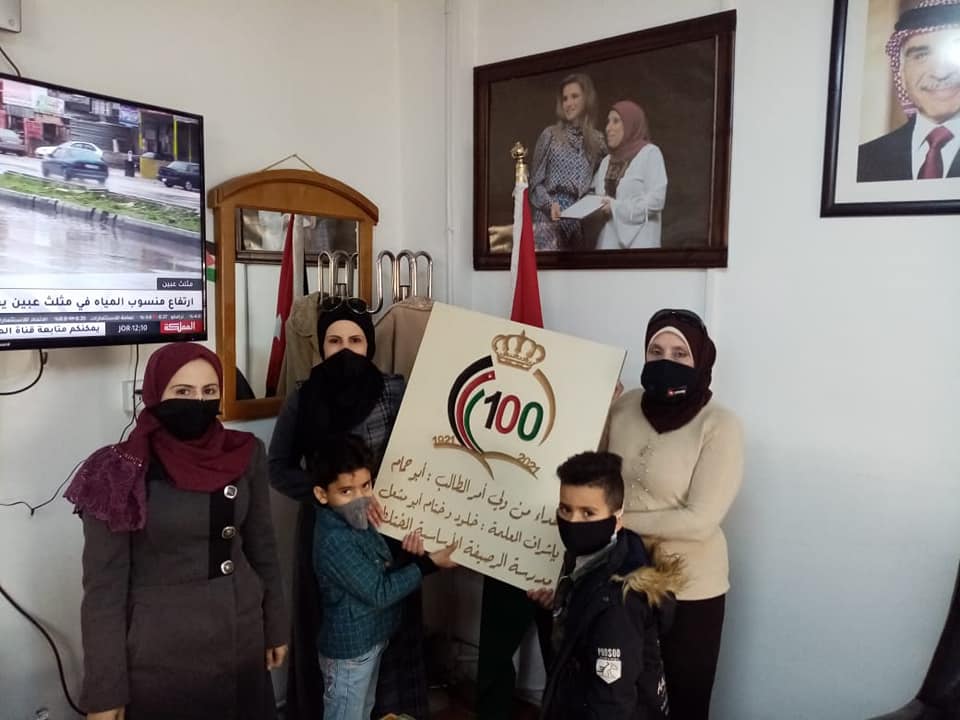 قام الطفلين ينال أبو حمام وأمير ابو حمام بإشراف المعلمتين خلود ابو مشعل وختام ابو مشعل بإهداء مديرة مديرية التربية والتعليم للواء الرصيفة الدكتورة رابعة العبدالله بلوحة جدارية تمثل شعار المئوية