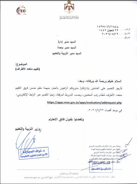 فأرجو التعميم على العاملين بإدارتكم/ مديريتكم الراغبين بالعمل بمهمة مقيّم ضمن فريق التقييم متعدد الأطراف لنظام رتب المعلمين، وحسب الشروط المرفقة، راجيا التقديم عبر الرابط الإلكتروني اضغط هنا