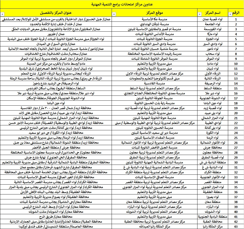 عناوين مراكز امتحانات برامج التنمية المهنية