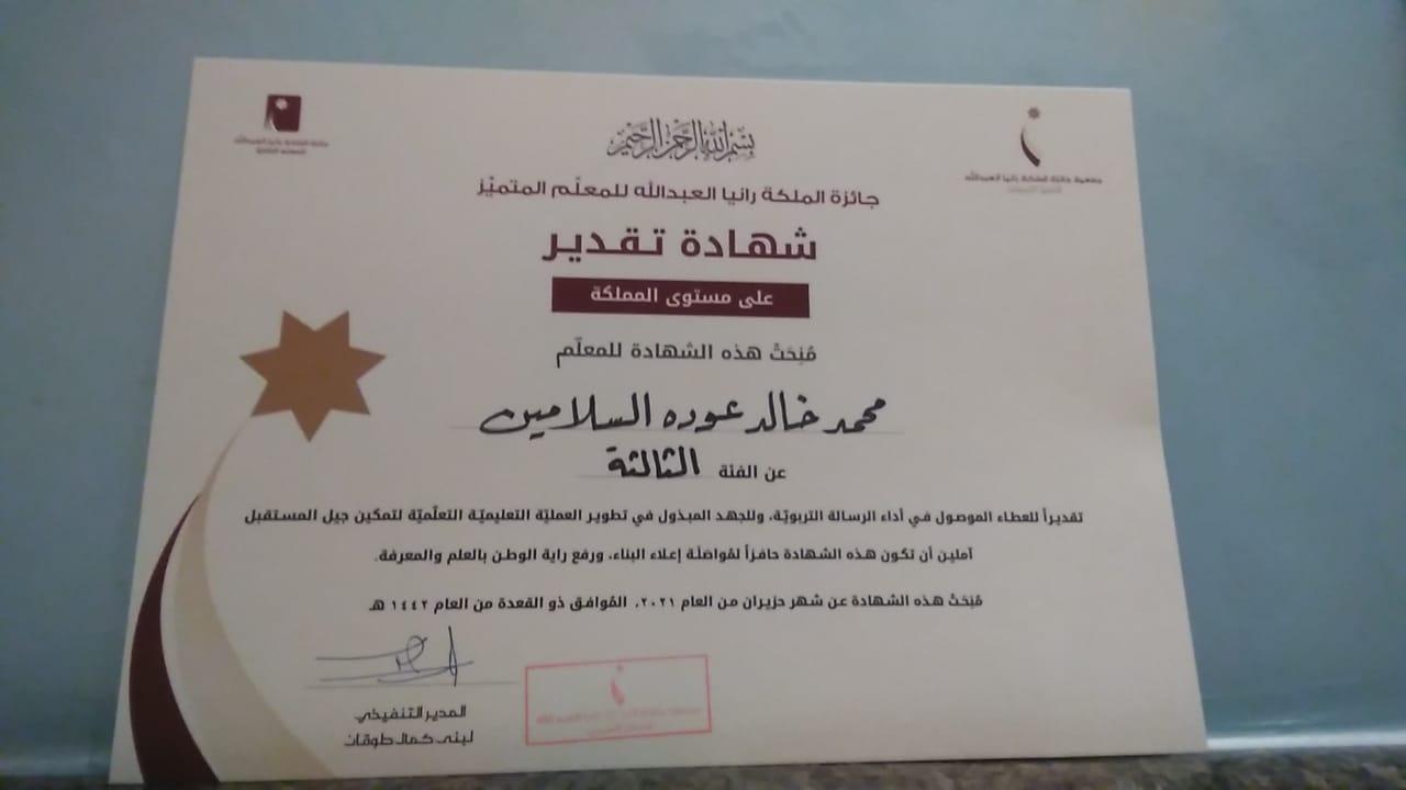 بمشاعر الفخر والاعتزاز يبارك عطوفة مدير التربية والتعليم د. محمد الشقيرات والاسرة التربوية في لواء البترا حصول المرشدة التربوية ختام محمد المساعده على المركز الثالث في جائزة الملكة رانيا للمعلم والمرشد المتميز لعام ٢٠٢٠_٢٠٢١م ،و حصول المعلم محمد خالد السلامين على شهادة تقدير على مستوى المملكة في جائزة الملكة رانيا للمعلم و المرشد المتميز لعام ٢٠٢٠_٢٠٢١م، الشكر الجزيل لمنسق الجائزة المشرف التربوي الاستاذ محمود الرواضية.