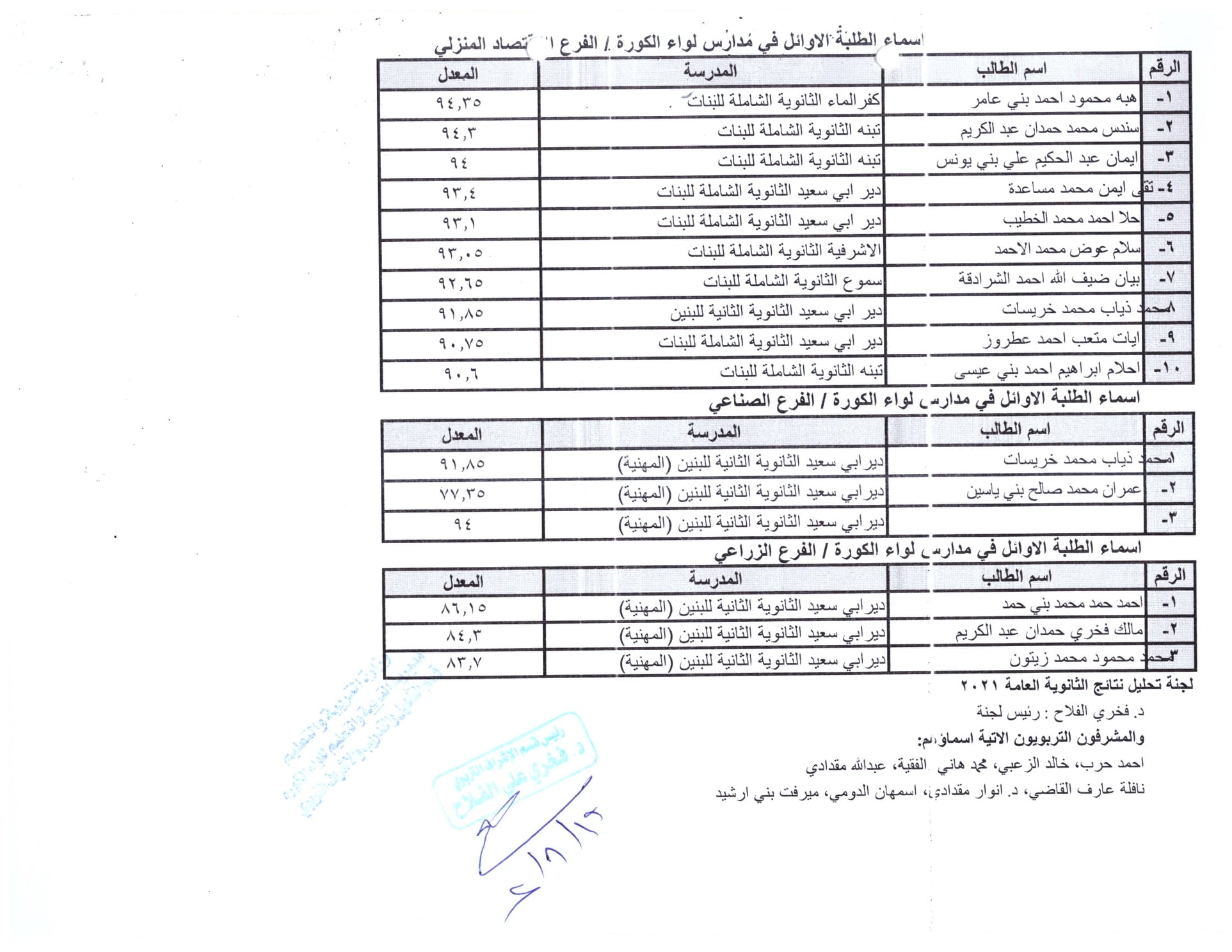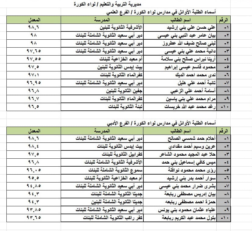 يَتَقَدَّم عُطوفة مُدير التربيةِ والتعليمِ للواء الكورة الدكتور معن الشناق، بِاِسْمه، ونِيَابَةً عن الأسرةُ التَّربويَّة في مديريةِ التربيةِ والتعليمِ للواء الكورة، بأسمى آيات التهنئة والتبريك لطَّلبة الثَّانوية العامَّة النِّظَامِيِّين الْعُشْرَة الْأوَائِل في الْفُرُوع؛ ( الفرع العلمي، الفرع الأدبي، الفرع الصناعي، الفرع الزراعي ) على مستوى المديرية لعام 2021، فهنيئًا لذويكم نجاحكم، وحقَّ لهم أن يفخروا بكم، وقد كان لهم دورٌ كبيرٌ في دعمكم ومساندتكم، والشُّكرُ الموصول لمُعلِّميكم الذين ما بخلوا يومًا في عطائهم لكي تُحقِّقوا أهدافكُم وطموحاتكُم التي تصبون إليها.