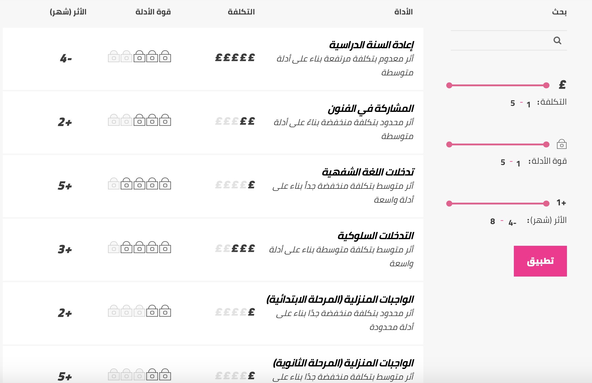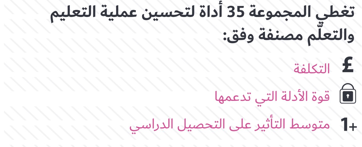 أطلقت مؤسسة الملكة رانيا للتعليم والتنمية مجموعة أدوات التعليم والتعلّم على موقعها الإلكتروني. توفّر هذه المجموعة ملخصات للأبحاث والأدلة العالمية والعربية فيما يخصّ ٣٥ أسلوبًا وأداة يمكن تطبيقها في المدارس؛ بهدف تحسين العملية التعليمية، وذلك عن طريق مساعدة المعلمين ومديري المدارس على اتخاذ القرارات المعنيّة بتحسين مخرجات التعلّم. كما تقدّم المجموعة معلومات حول مدى تأثير كل أداة على مخرجات تعلّم الطلبة، وقوة الأدلة الداعمة لها، والكلفة التقديرية لتطبيقها.