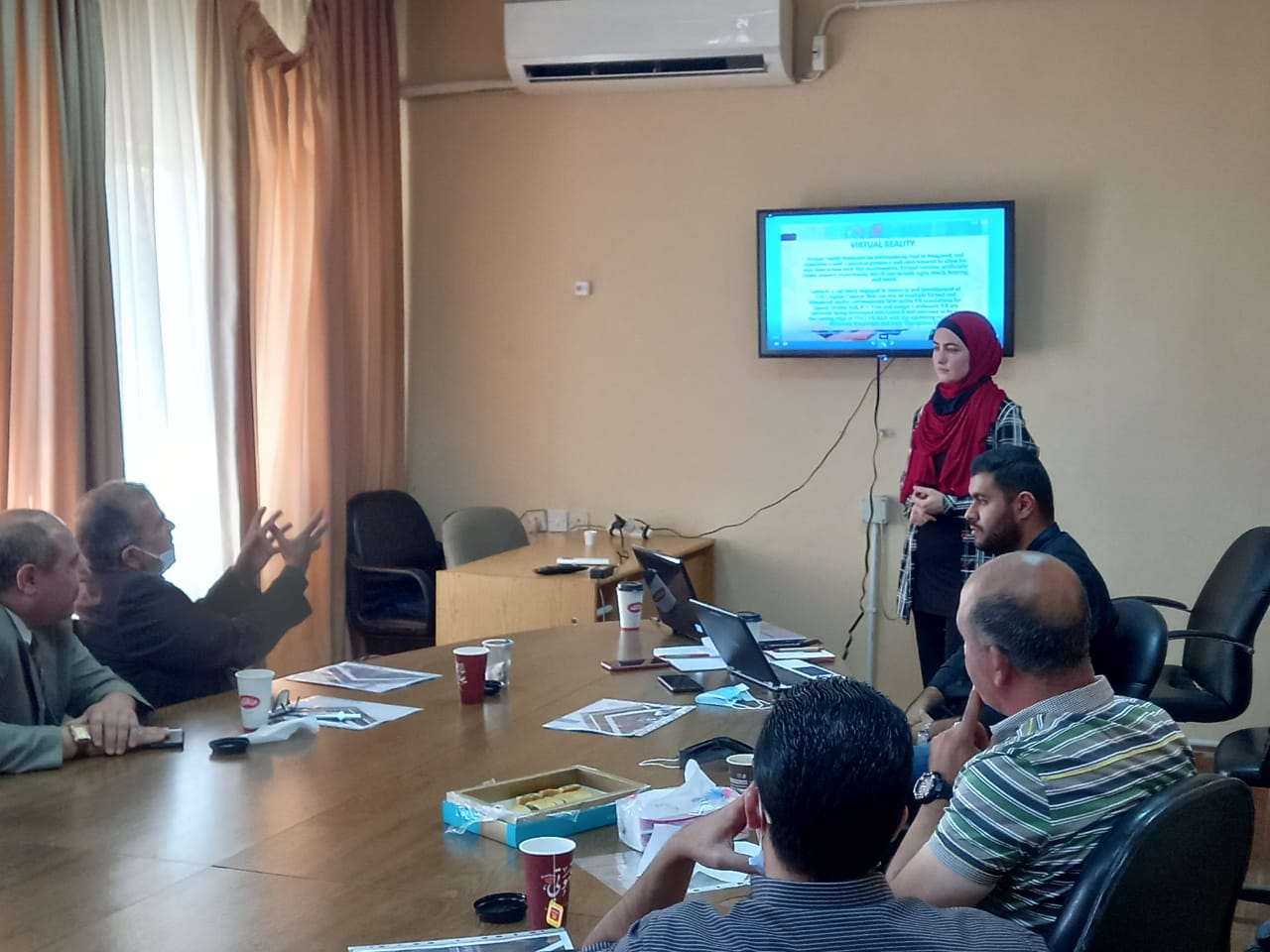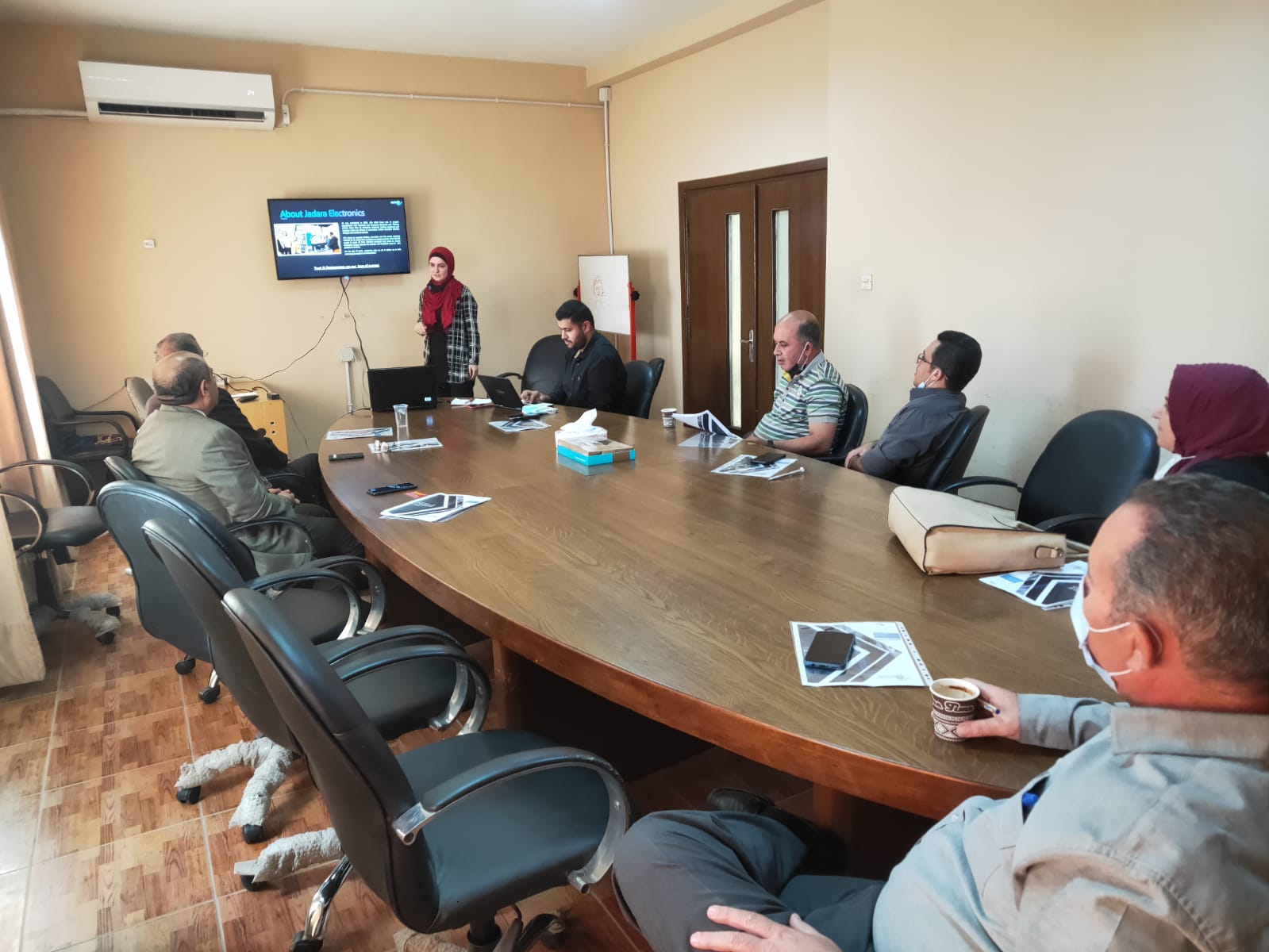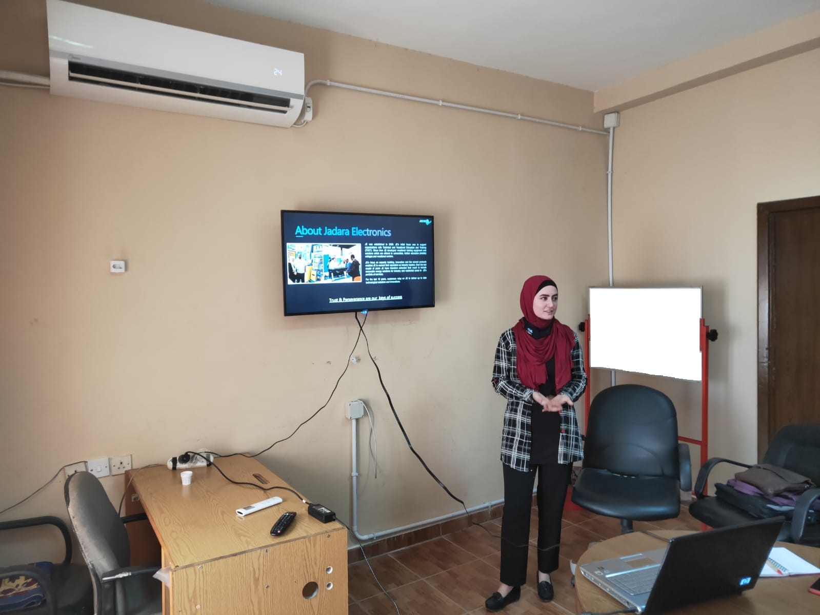 وقامت م.حنان احياد من شركة جدارة بشرح مفصل عن الاجهزة التعليمية في مجال مشاغل الالكترونيات الاتصالات ومشاغل التكييف والتبريد ومشاغل الكهرباء ومشاغل كهرباء المركبات ومشاغل ميكانيك المركبات ، كما قد تم عرض مجموعة من البرامج الحاسوبية والخاصة بمحاكاة للواقع الافتراضي (VR) للتمارين العملية في المشاغل التعليمية من قبل م.حنان و م.احمد من شركة جدارة.